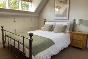 The staircase opens directly into a charming double bedroom with an antique-style metal bed frame, an oak chest of drawers and a matching bedside table and lamp. The eaves provide ample storage for footwear or luggage and there is a high dormer window with views over Fisherhead and beyond.