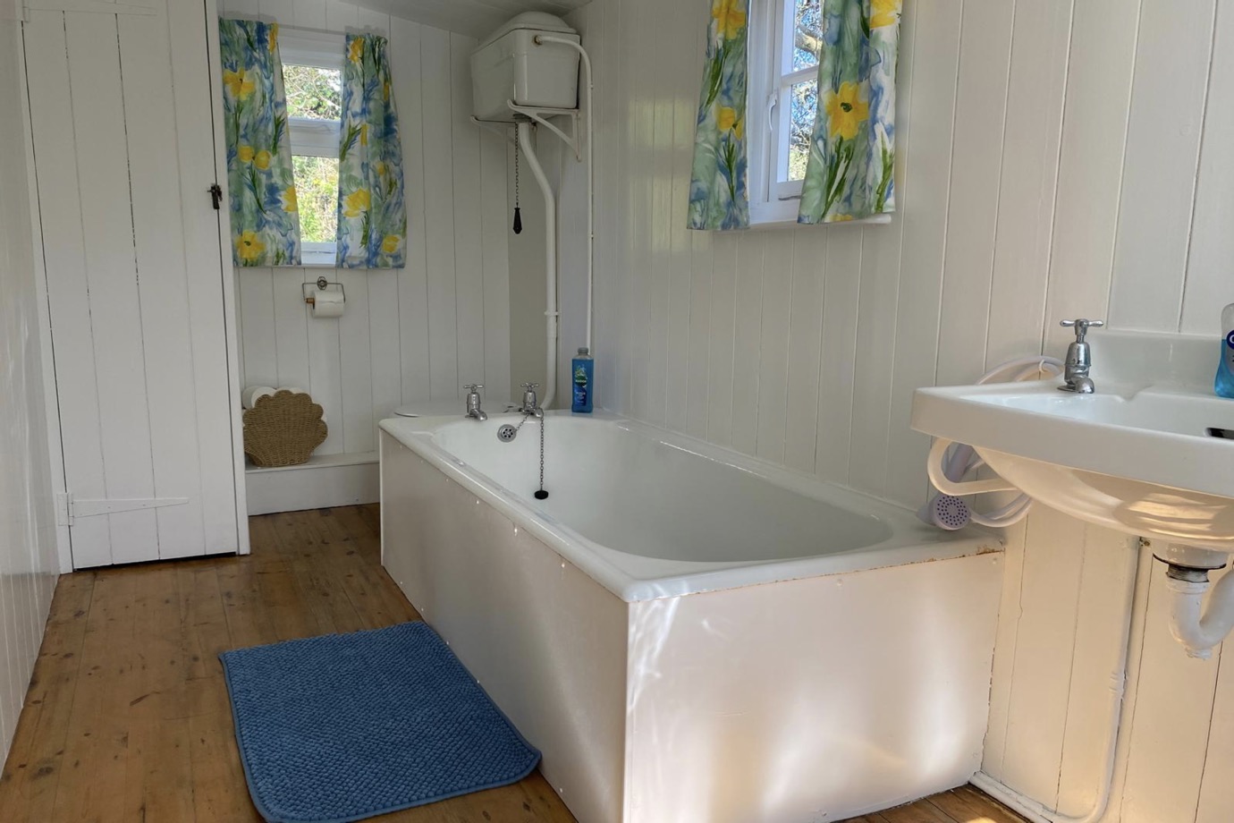A door to the rear of the main room leads into a spacious bathroom which runs the length of the cabin. There is a lovely old bath, deep enough to soak away the aches and pains of a long walk, a washbasin, a high-flush WC, electric wall heater and a drying rack.