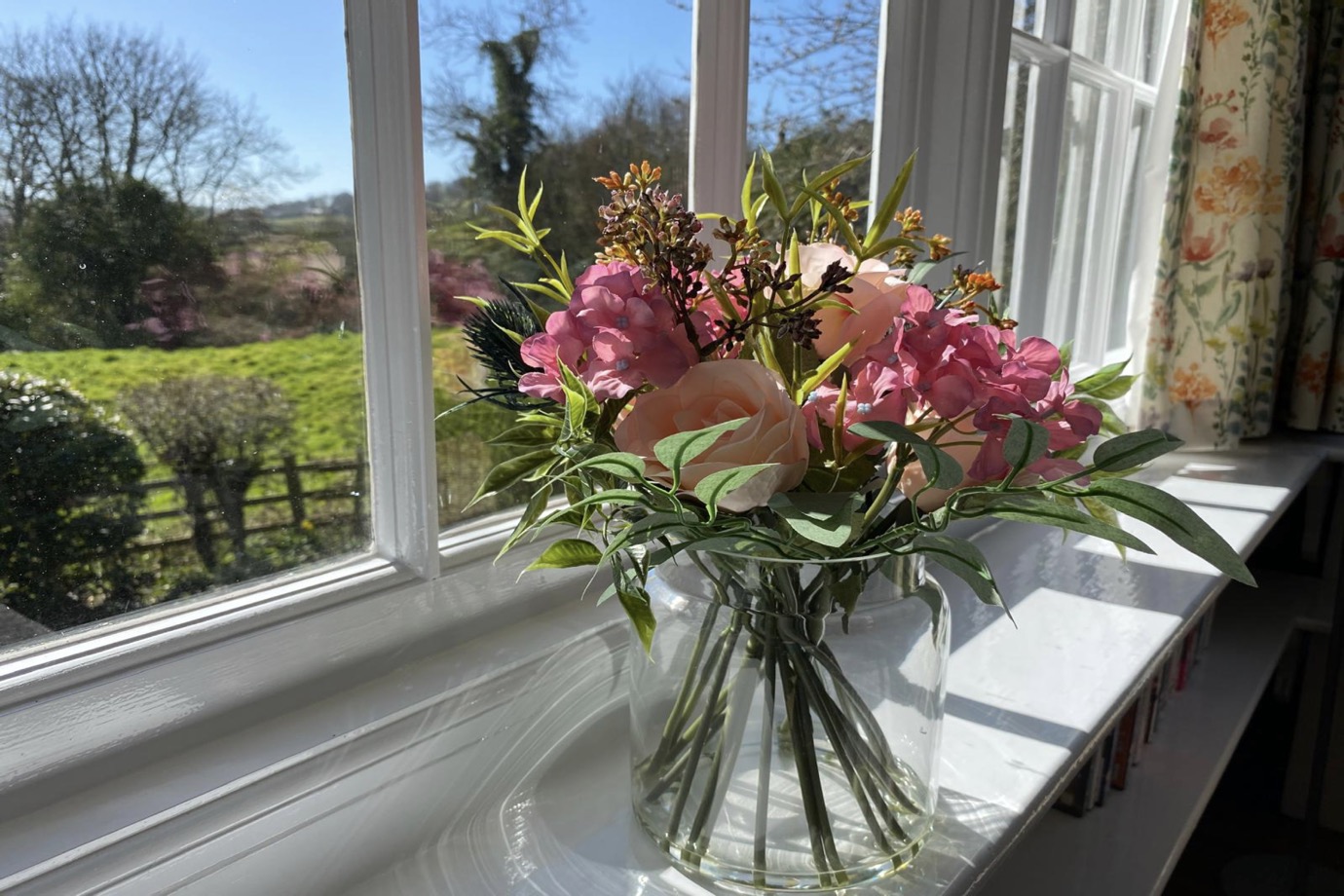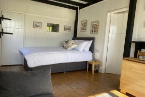 The front door leads directly into the main studio room lounge area with polished wooden floorboards, a futon sofa with occasional tables and a drop-leaf dining table and chairs. There is a small flat-screen TV with DVD player and an excellent selection of local books, walking guides, tide tables, maps and books. Set to one side of the lounge is a double divan bed and the large picture windows in the room provide ample light and afford lovely open views over the countryside.