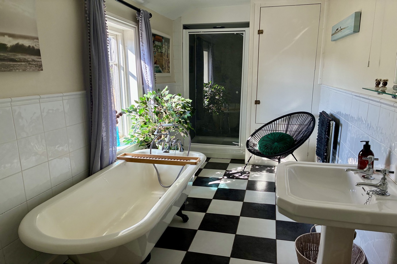 Also on this floor is a spacious and very charming bathroom with black & white tiled floor, a delightful free-standing roll-top bath, separate shower cubicle, WC and wash basin.