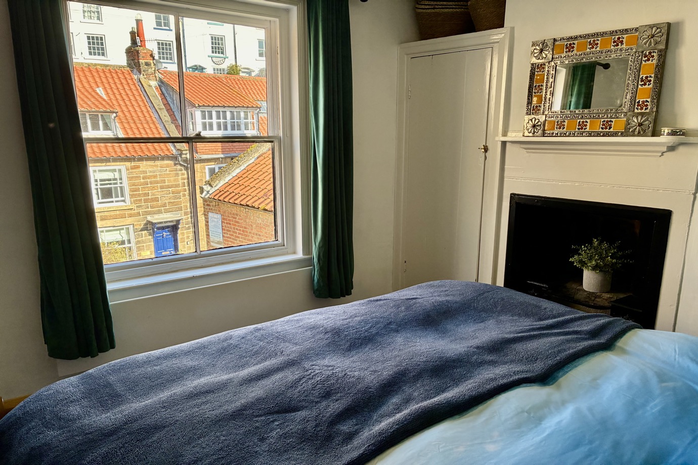 The steep steps up to the first floor bring you to the master bedroom in which a queen size wooden sleigh bed takes centre stage and from which you can enjoy lovely views of the pantiled rooftops in the village. The large picture window in this room looks out onto the garden and lets the light flood in. There is also a chest of drawers for storage, a small bedside table, and a small occasional chair.