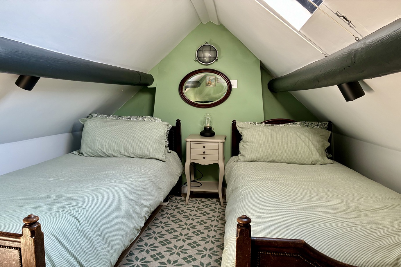 A door from the master bedroom leads up the steep stairs to the pretty attic bedroom, having 2 full-width single beds with spotlights, a small chest of drawers, a small occasional chair and a bedside table. Please note that access to the attic bedroom is through the master bedroom.
