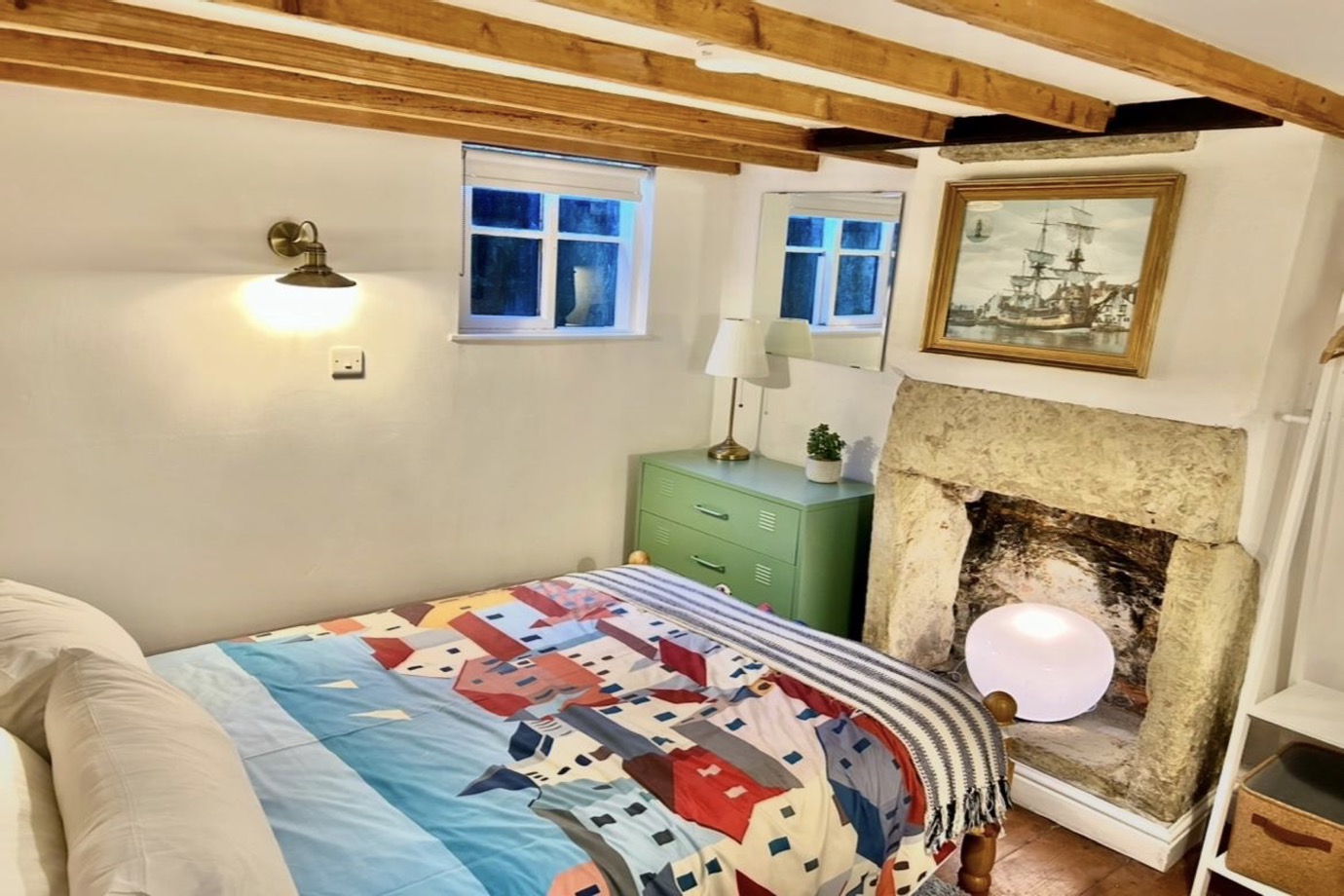 From the hallway, a door leads to a staircase down to the basement bedroom which comprises a 3/4 bed, free-standing clothes rail, chest of drawers and a beamed ceiling. The 2 understorey windows allow sufficient light into the room and a feature fireplace (non-working) completes the look.